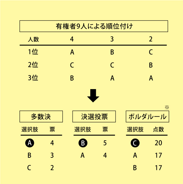 今度は「1位に3点、2位に2点、3位に1点」とするボルダルールを考えてみましょう。総得点を計算すると、Cが20点で最高得点になります。