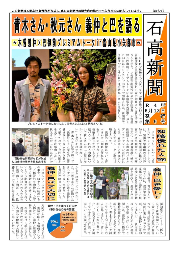 S:前日の取材では、義仲や巴についての認知度アンケート結果について伝えると、今回の大河ドラマで知ったと答えた人が多かったことに青木さんと秋元さんが驚かれ、「もっと知ってほしい」と語っておられたのが印象に残っています。