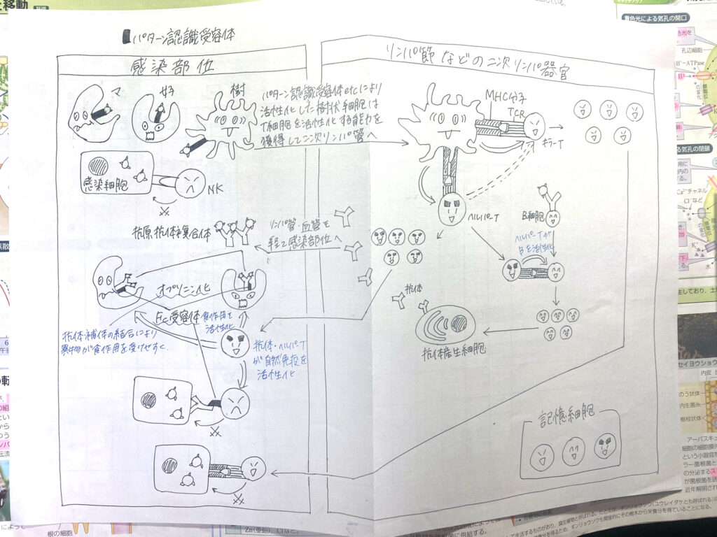 高1の時から授業を真面目に聞き、基礎を身につけていきました。単語は書いて覚える努力をし、実験問題は図説を使って現象を理解していきました。思考問題が解けない時は、自分の思考が止まった箇所を明確にしたうえで先生や友達に聞いたり、解答を読んだりして理解していきました。また、物質の動きをまとめた資料を自分で作成したことも良かったです。作る過程で情報が整理でき、理解が深まりました。