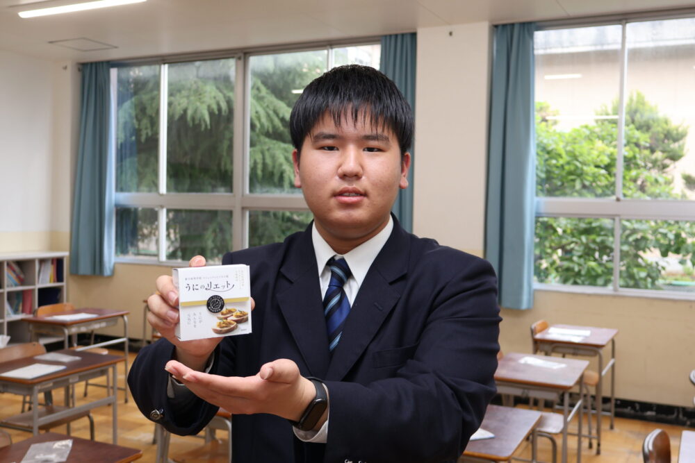 力を入れて作ったのは、缶詰「うにのリエット」。藻場を荒らすウニを有効活用しようと、ペースト状の料理にしました。オリジナル缶詰を作る高校生の全国大会で、賞を取れました。