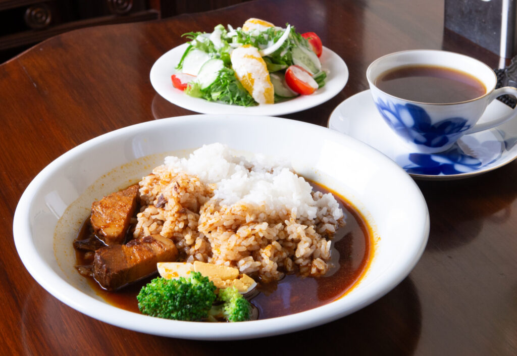 こだわりのブレンドコーヒーは、「自家焙煎珈琲ダックスファーム」(入善町)で焙煎した豆を使用。人気のブラックカレーは、複雑なスパイスの風味がほろほろに煮込んだポークの甘みを引き立てる。コーヒー片手に、穏やかな時間を満喫したい。